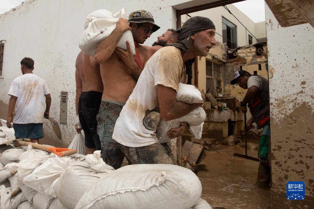 3月16日,人们在秘鲁首都利马南部的蓬塔赫尔莫萨地区建造临时堤坝,以阻挡暴雨造成的泥石流。
