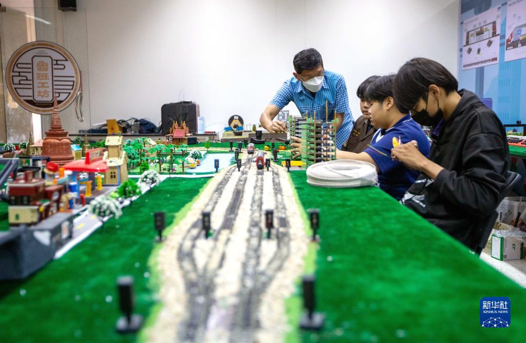 3月14日,在泰国大城府大城技术学院鲁班工坊铁院中心,教师(左一)在高铁运营沙盘教学区指导学生。