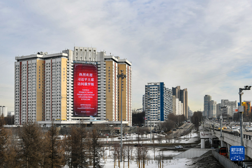 当地时间3月20日下午,国家主席习近平乘专机抵达莫斯科,应俄罗斯总统普京邀请,对俄罗斯进行国事访问。这是莫斯科街头的欢迎标语。