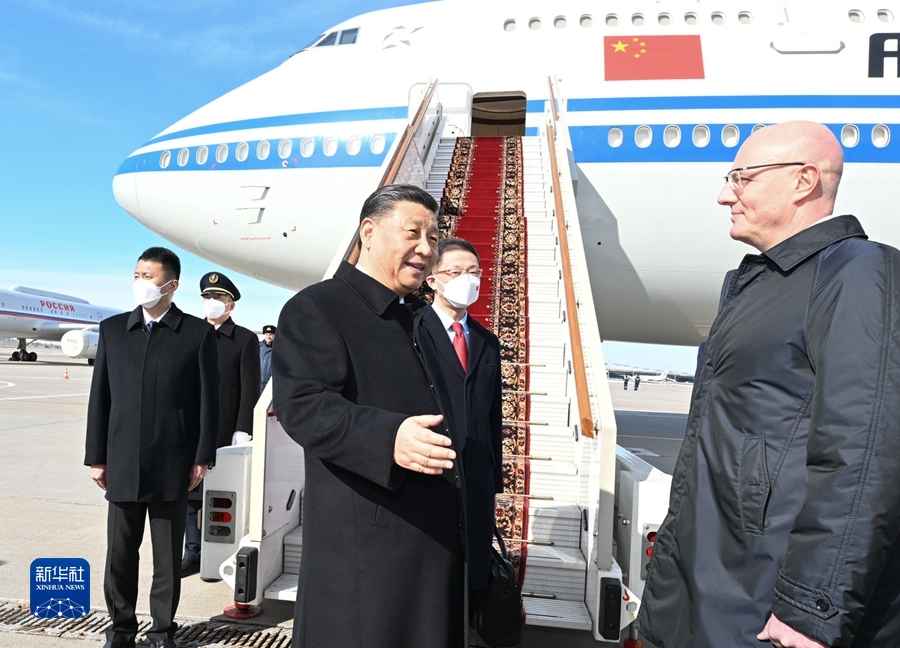 当地时间3月20日,国家主席习近平乘专机抵达莫斯科,应俄罗斯总统普京邀请,对俄罗斯进行国事访问。下午1时许,习近平乘坐的专机抵达莫斯科伏努科沃专机机场。习近平步出舱门时,俄罗斯副总理切尔内申科等政府高级官员在舷梯旁热情迎接。新华社记者 谢环驰 摄