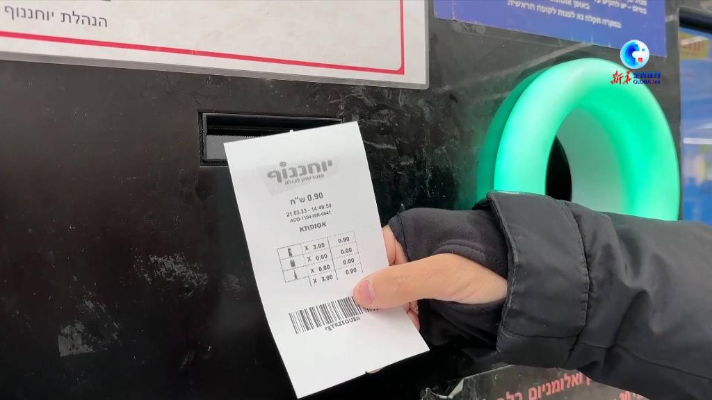 空瓶被依次投入机器后,机器识别出数量开具小票,人们拿着小票到柜台以每个0.3新谢克尔(约合0.6元人民币)的价格换取现金即可。