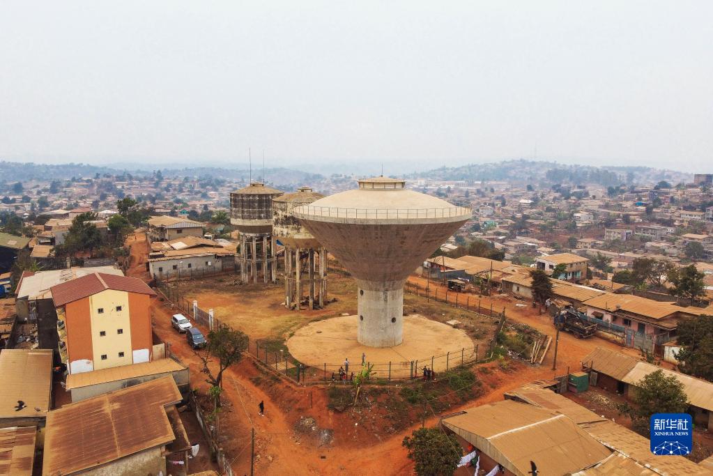 这是3月2日在喀麦隆西部大区巴富萨姆拍摄的中企援建的水塔(无人机照片)。