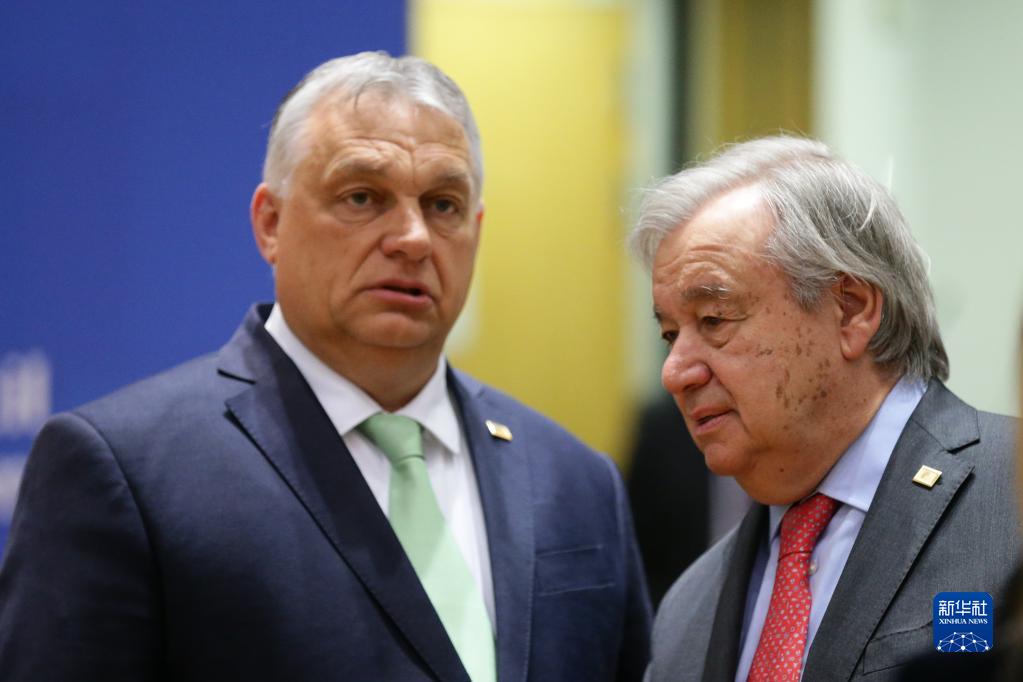 3月23日,在比利时布鲁塞尔的欧盟总部,联合国秘书长古特雷斯(右)与匈牙利总理欧尔班在欧盟峰会开始前交谈。