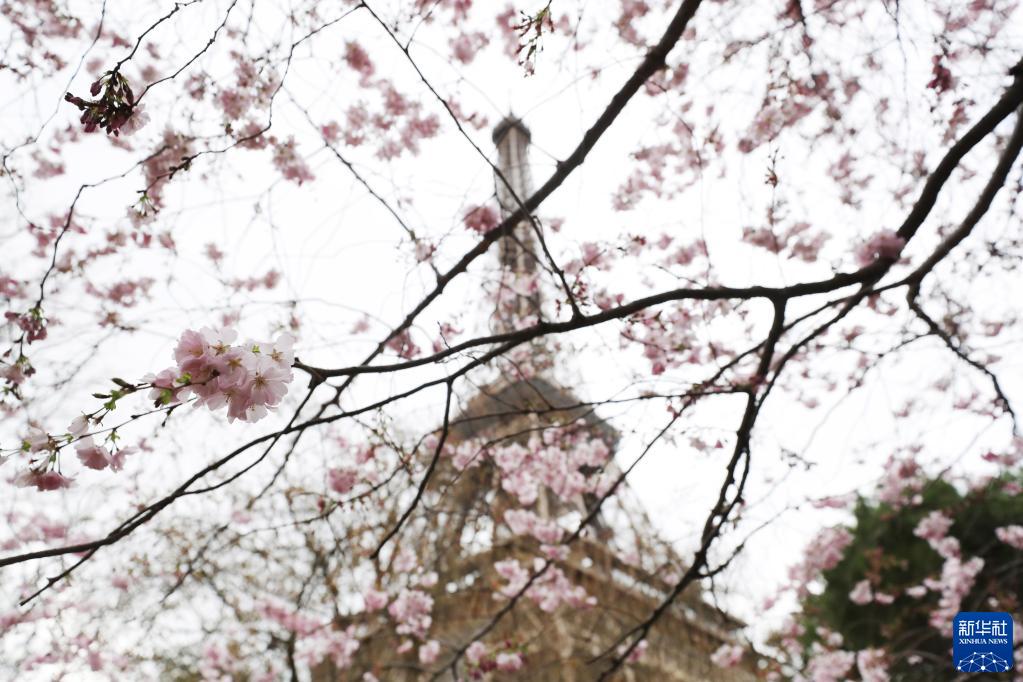 3月19日,法国巴黎埃菲尔铁塔下春花绽放。