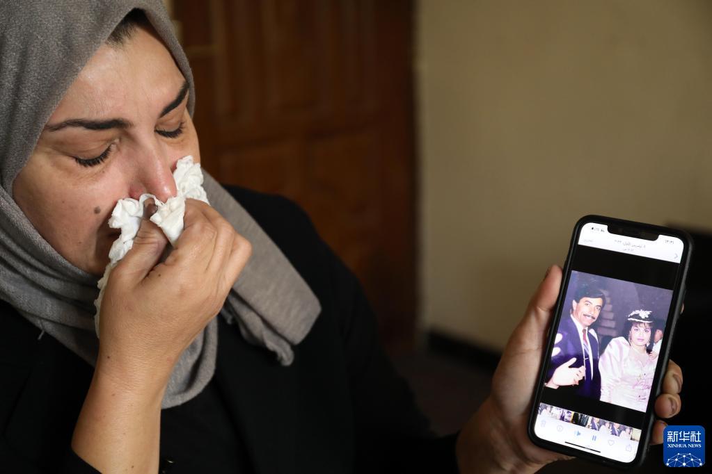 2月14日,在伊拉克北部萨拉赫丁省祖卢耶镇,松杜丝·拉米展示她和丈夫阿米尔的合影。