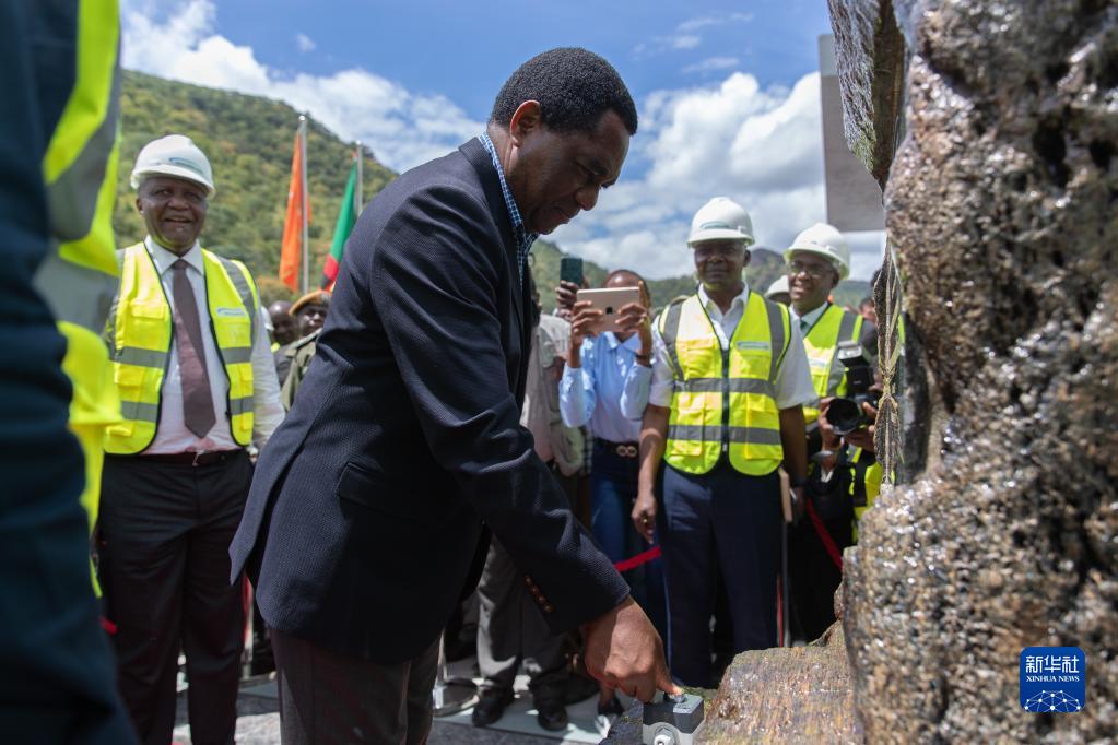 3月24日,在赞比亚南方省,赞比亚总统哈凯恩德·希奇莱马为下凯富峡水电站5号机组按下启动按钮。