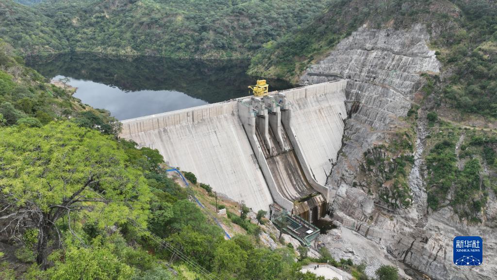 这是3月23日在赞比亚南方省航拍的下凯富峡水电站大坝。