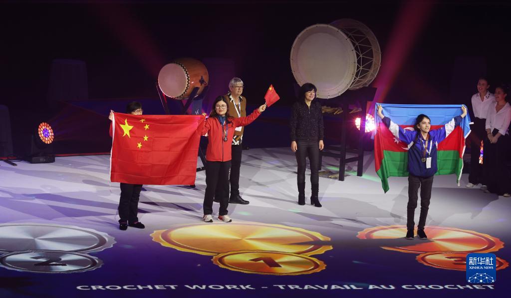 3月25日,在法国梅斯举行的第十届国际残疾人职业技能竞赛中,在钩针编织比赛中分获冠亚军的中国选手胡春芳(左二)和沙红英(左一)上台领奖。