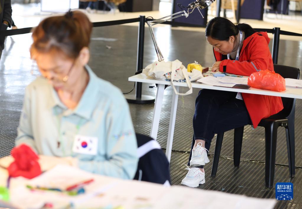 3月25日,在法国梅斯举行的第十届国际残疾人职业技能竞赛中,中国选手龚兰(右)参加刺绣比赛。
