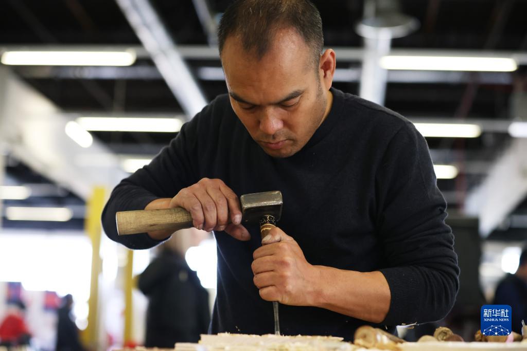 3月25日,在法国梅斯举行的第十届国际残疾人职业技能竞赛中,最终获得铜牌的中国选手吴向东正在参加木雕比赛。