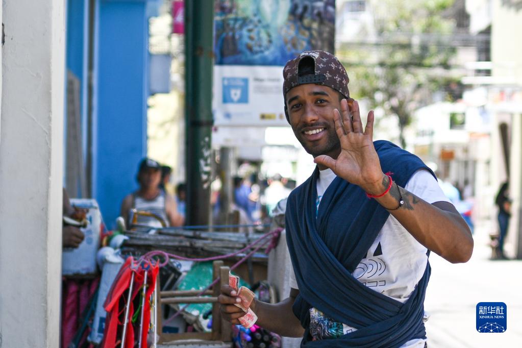 3月26日,一名男子在洪都拉斯首都特古西加尔巴一处街道上面对镜头挥手致意。