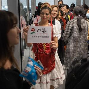 3月26日,在匈牙利布达佩斯机场,一名女士身穿匈牙利民族服装欢迎中国游客到来。