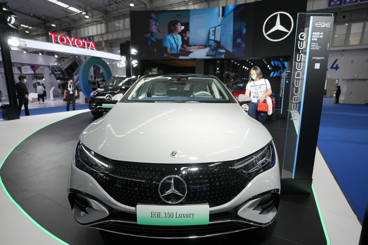 2022年11月6日在第五届进博会汽车展区奔驰汽车展台拍摄的新能源汽车。新华社记者金皓原摄