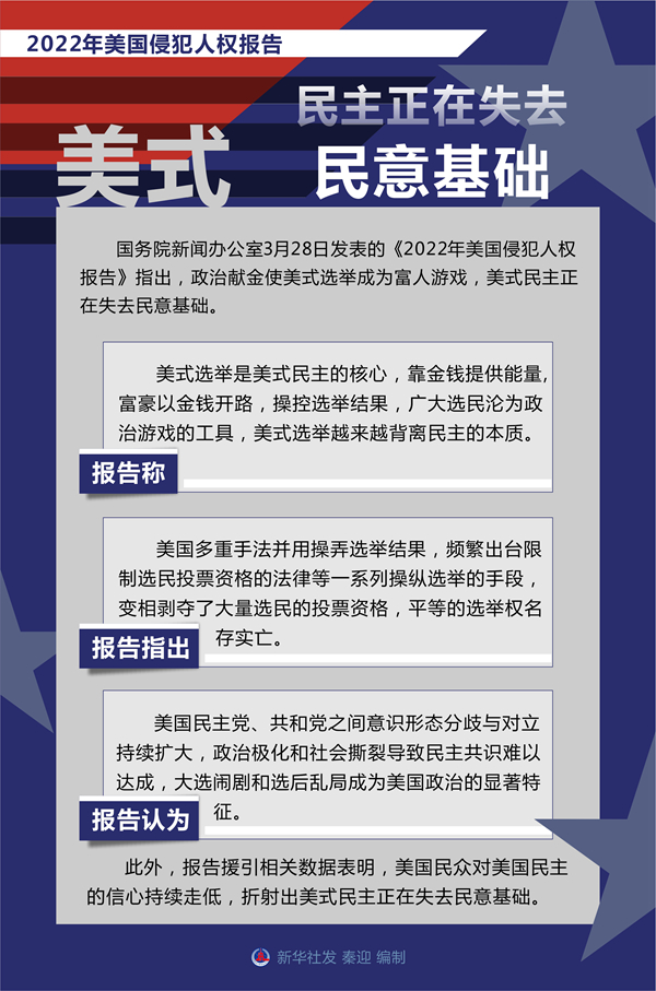 新华社北京3月28日电 国务院新闻办公室28日发表的《2022年美国侵犯人权报告》指出,政治献金使美式选举成为富人游戏,美式民主正在失去民意基础。