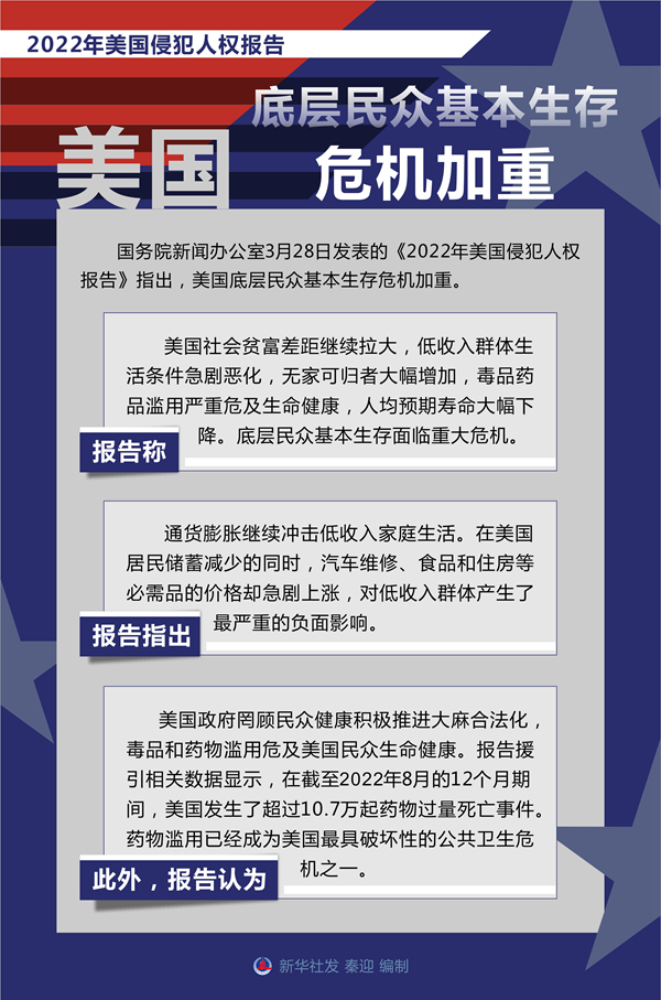 新华社北京3月28日电 国务院新闻办公室28日发表的《2022年美国侵犯人权报告》指出,美国底层民众基本生存危机加重。