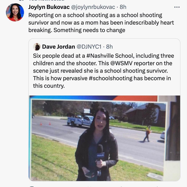 田纳西州当地电视台记者乔伊林·布科瓦茨赶往现场报道枪击案,并在连线出镜时坦露,自己曾在学生时代遭遇校园枪击案。