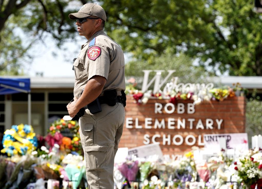 2022年5月27日,警察在美国得克萨斯州南部尤瓦尔迪市发生枪击事件的小学外执勤。新华社记者吴晓凌摄