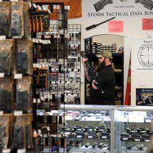 图为2017年10月4日拍摄的照片,在美国拉斯维加斯的“新前线”枪械商店,一名店员为顾客展示枪支。新华社记者 王迎 摄