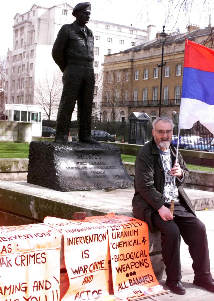 2001年4月11日,在英国伦敦首相府对面的二战英军元帅蒙哥马利的青铜雕像前,一位南斯拉夫老人手举南斯拉夫国旗,抗议以美国为首的北约轰炸南联盟,并在轰炸中使用贫铀弹,给当地造成严重环境污染。新华社记者侯少华摄