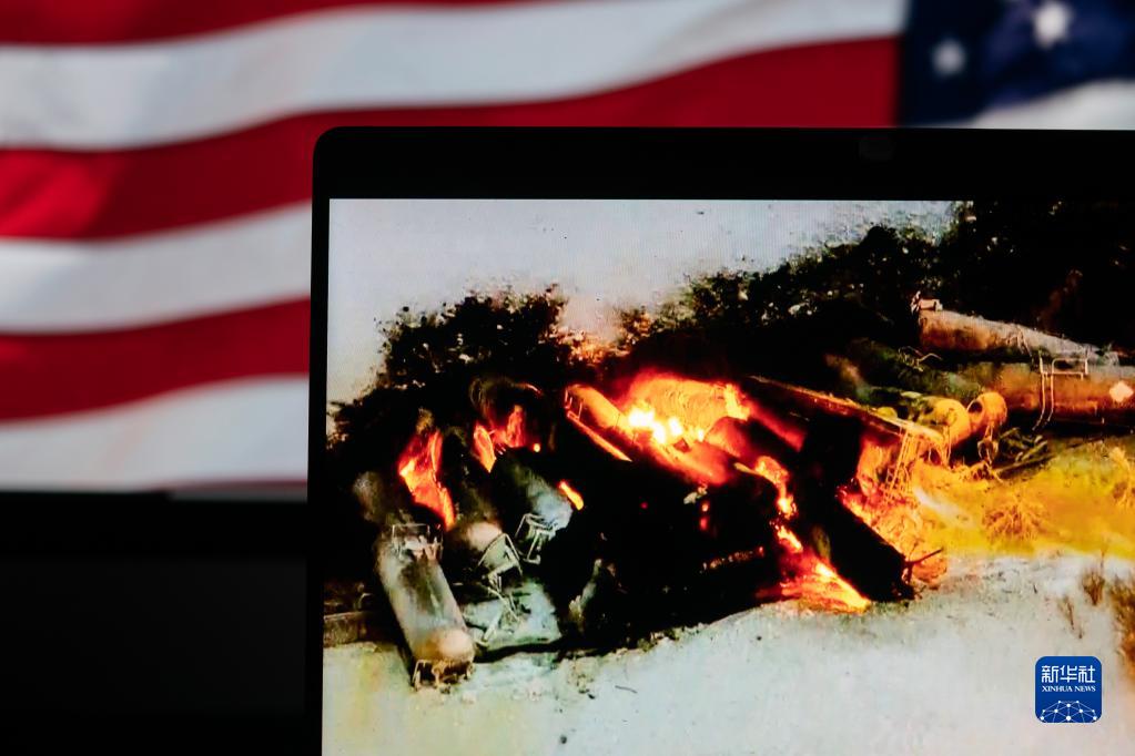 3月30日在美国阿灵顿拍摄的屏幕显示美国明尼苏达州货运列车脱轨事故现场画面。
