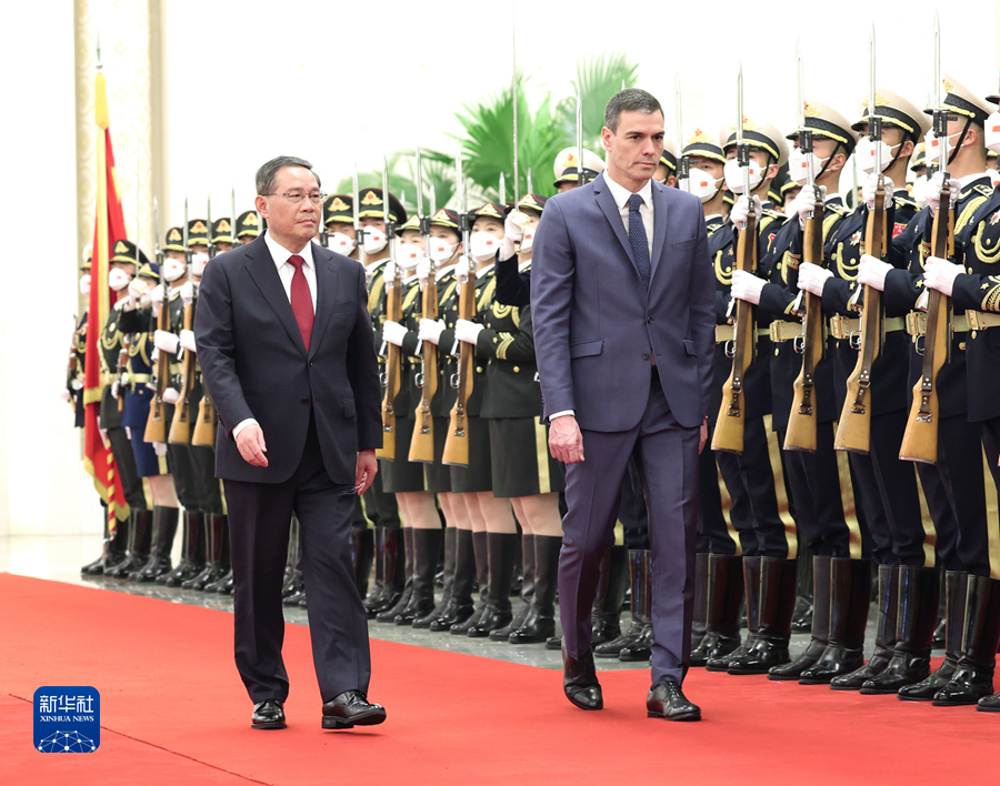会谈前,李强在人民大会堂北大厅为桑切斯举行欢迎仪式。