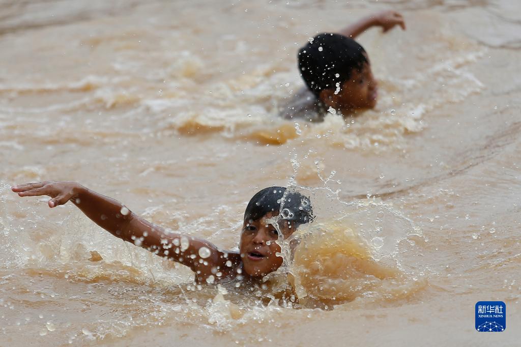 3月31日,在巴西阿克里州里奥布朗库,孩子们在积水的街道上游泳。