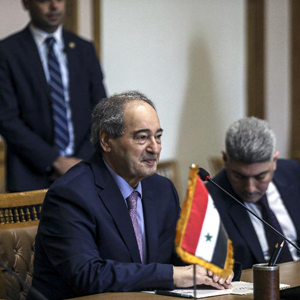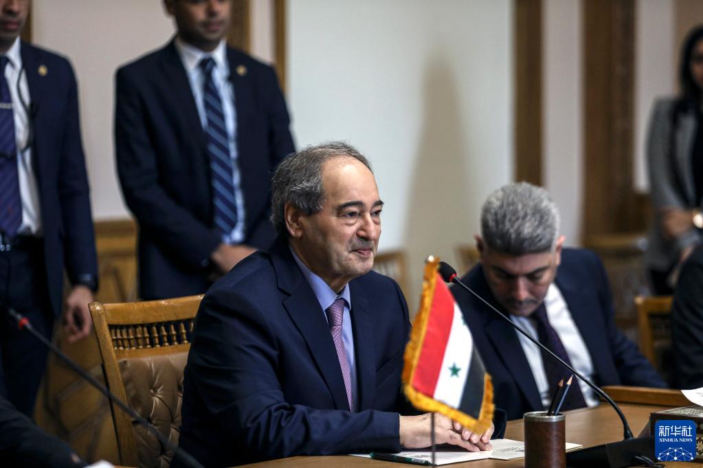 4月1日,在埃及首都开罗,叙利亚外长梅克达德(中)与埃及外长舒凯里(不在画面中)举行会谈。