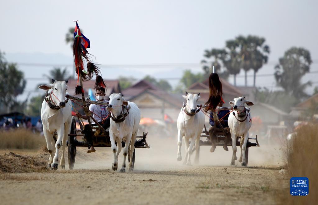 4月2日,在柬埔寨南部磅士卑省,当地农民参加赶牛车比赛。