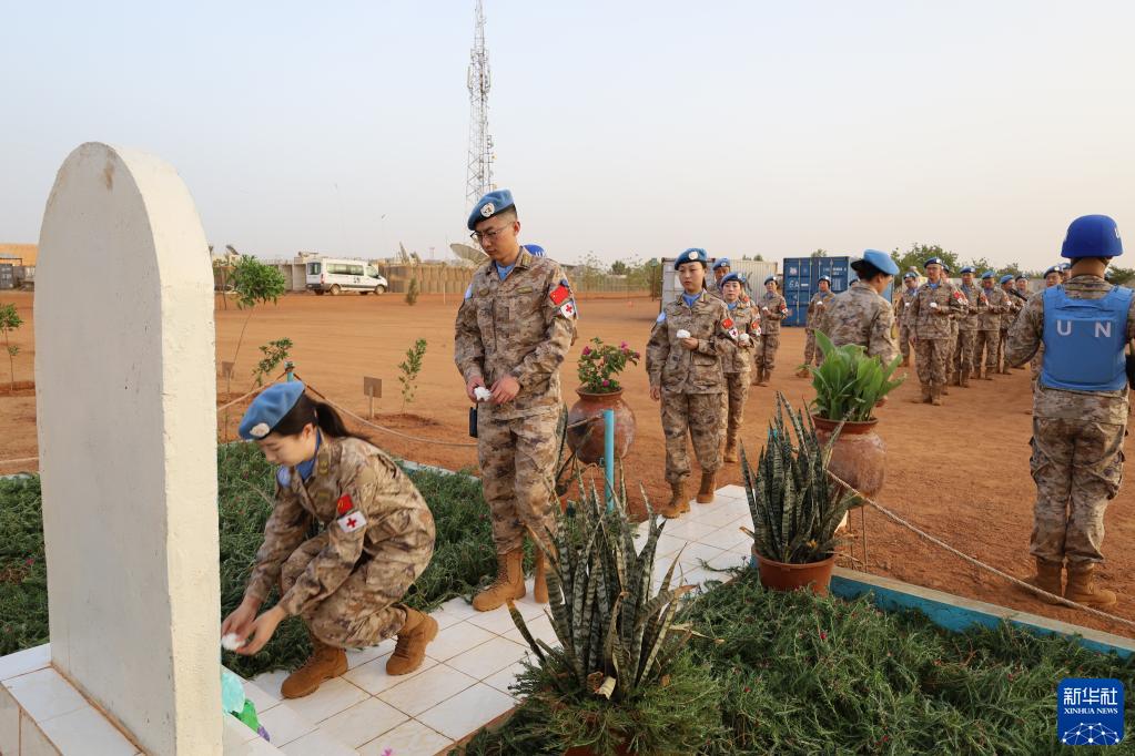 中国第十批赴马里维和医疗分队当日在联合国驻马里多层面综合稳定特派团(马里稳定团)东战区加奥超营的维和烈士广场开展清明祭扫活动,悼念蓝盔忠魂。