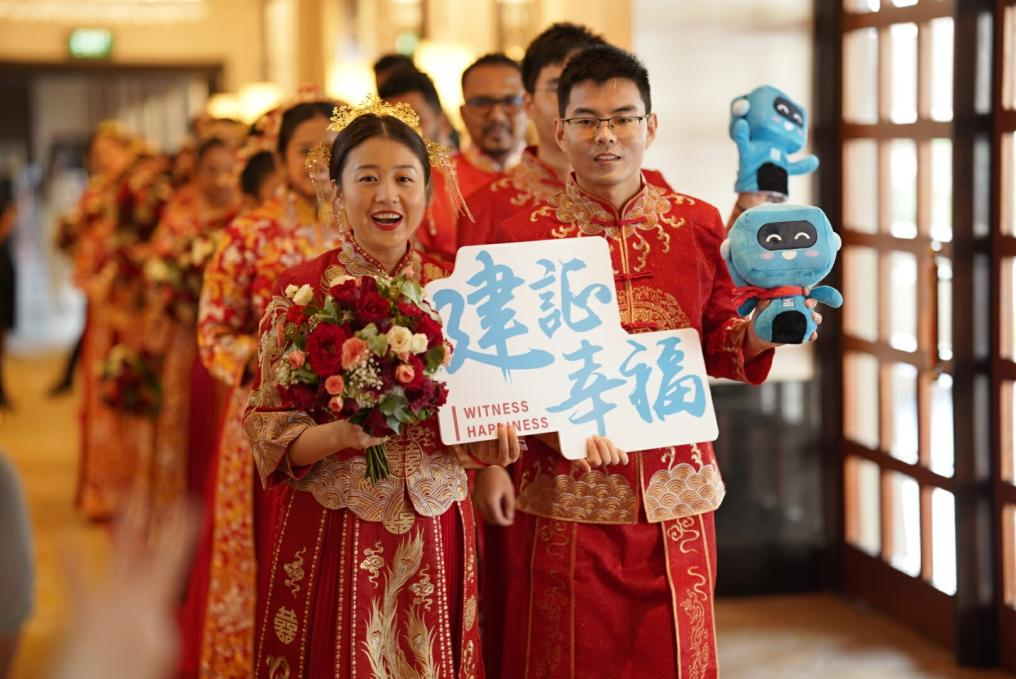 伴随着浪漫轻快的婚礼进行曲和斯里兰卡传统吉祥舞蹈,5对中籍新人、10对斯籍新人身着中式喜服,踏着红毯,在婚礼现场所有人共同见证下,许下爱的誓言、夫妻对拜、喝交杯酒……