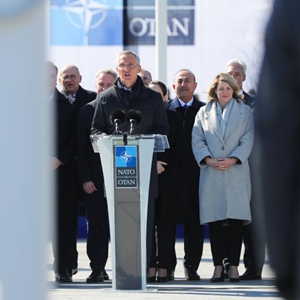 4月4日,在比利时布鲁塞尔的北约总部,芬兰总统尼尼斯托(左)和北约秘书长斯托尔滕贝格对媒体发言。新华社记者郑焕松摄