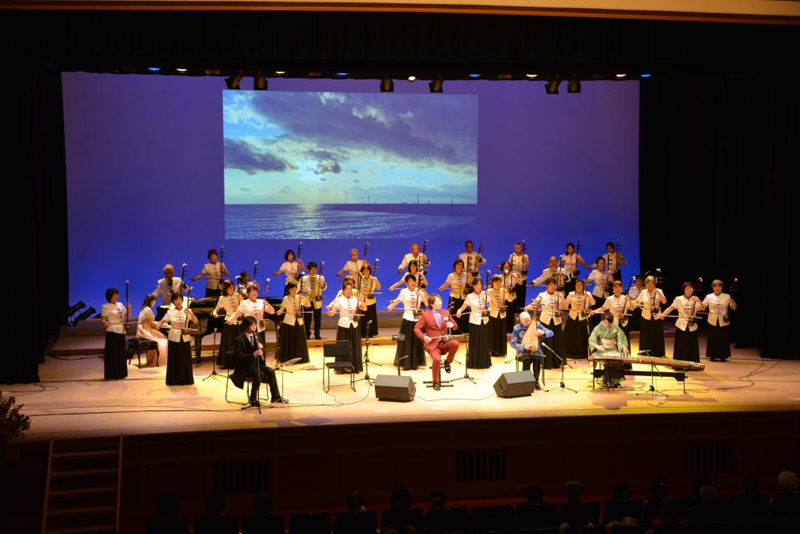 音乐会上,来自中日两国的二胡、琵琶、尺八演奏家及当地二胡爱好者、中小学生共同演奏了《来吧,春天》、《风月同天》、《万马奔腾》、《风》、《樱花》等精彩曲目。