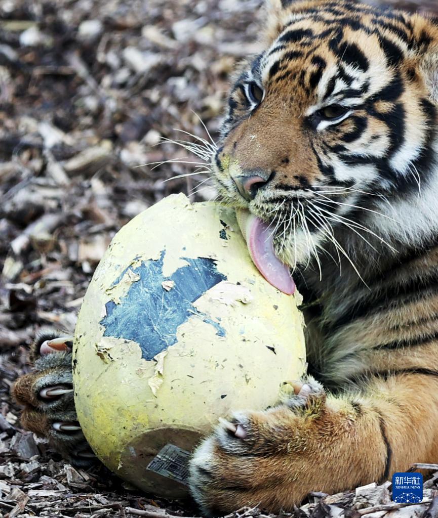 4月5日,在英国伦敦动物园,一只苏门答腊虎享用“彩蛋大餐”。