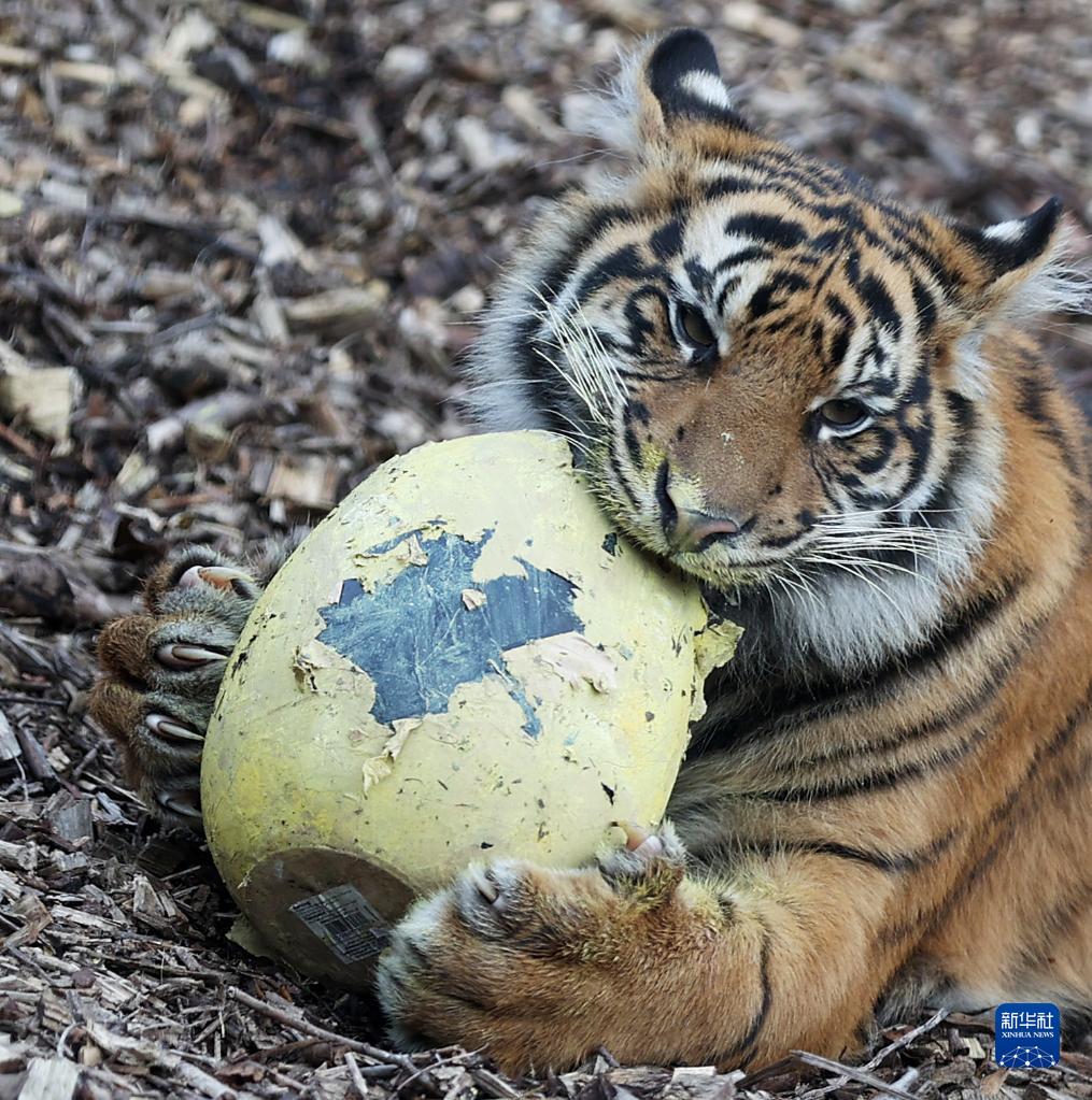 4月5日,在英国伦敦动物园,一只苏门答腊虎享用“彩蛋大餐”。