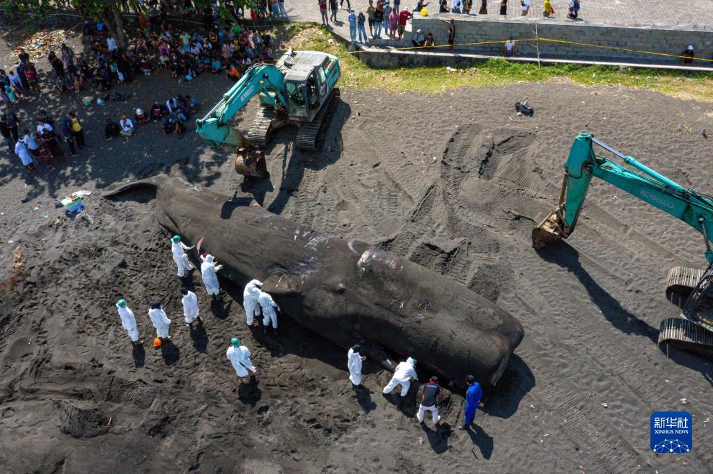 这头抹香鲸5日在巴厘岛克隆孔的海滩搁浅。