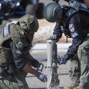 4月6日,在以色列北部的什洛米镇,安全人员处理一枚火箭弹。新华社/基尼图片社
