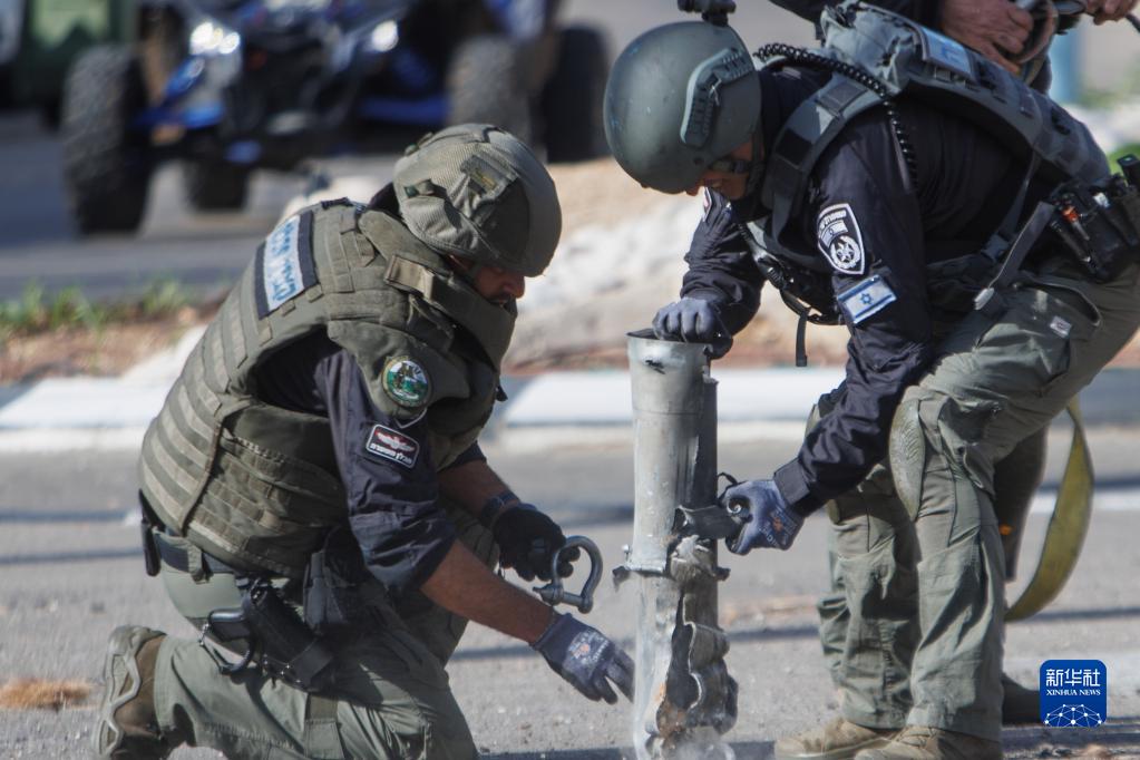4月6日,在以色列北部的什洛米镇,安全人员处理一枚火箭弹。