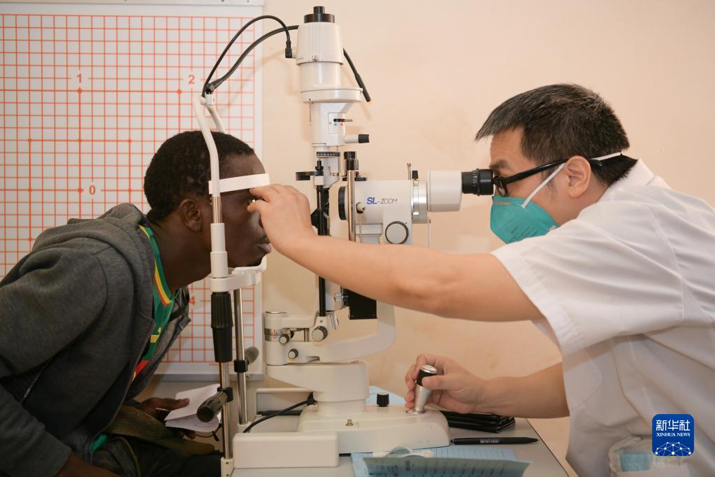 3月21日,在塞内加尔迪亚姆尼亚久儿童医院,中国第19批援塞内加尔医疗队眼科医生严端为患者做检查。