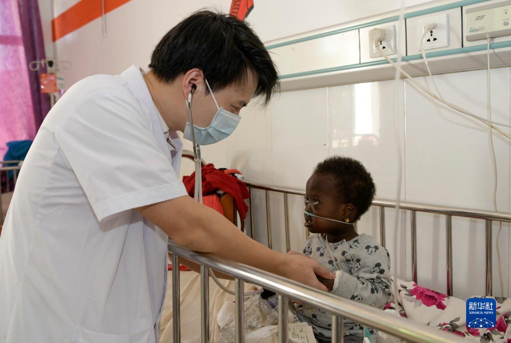 3月21日,在塞内加尔迪亚姆尼亚久儿童医院,中国第19批援塞内加尔医疗队儿科医生汤荣宁为患儿做检查。