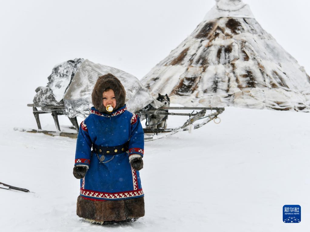 4月7日,在俄罗斯亚马尔-涅涅茨自治区,一名涅涅茨儿童站在自家帐篷前。