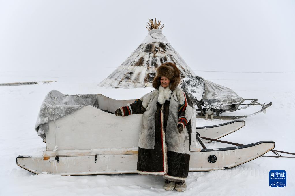 4月7日,在俄罗斯亚马尔-涅涅茨自治区,一名涅涅茨妇女站在自家帐篷前。