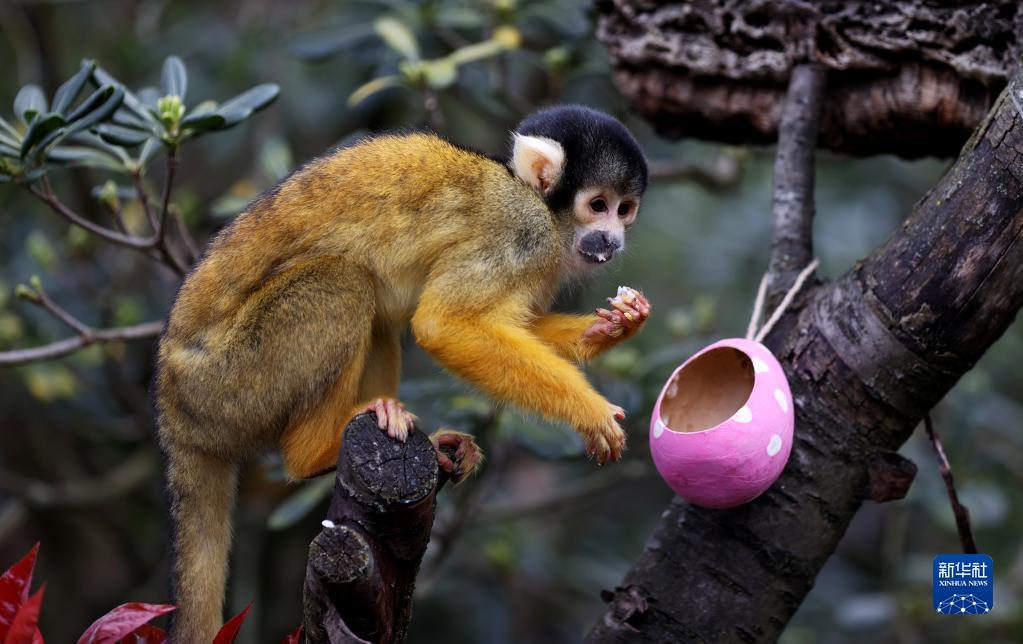 4月5日,在英国伦敦动物园,一只松鼠猴享用“彩蛋大餐”。