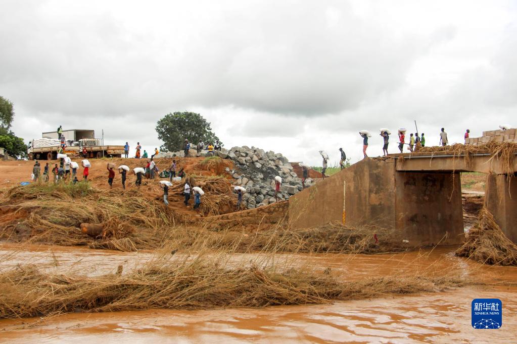 3月31日,工人在马拉维姆兰杰一处受损的桥梁上搬运物品。
