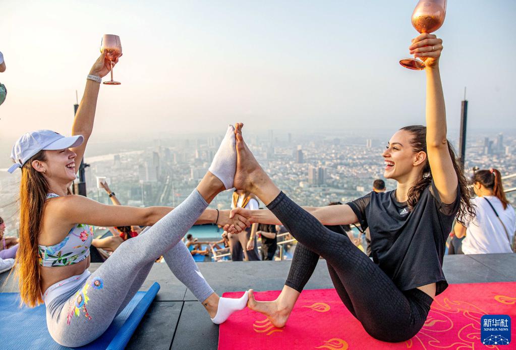 当日,数十名瑜伽爱好者在曼谷王权云顶大厦顶层观景平台体验高空瑜伽。
