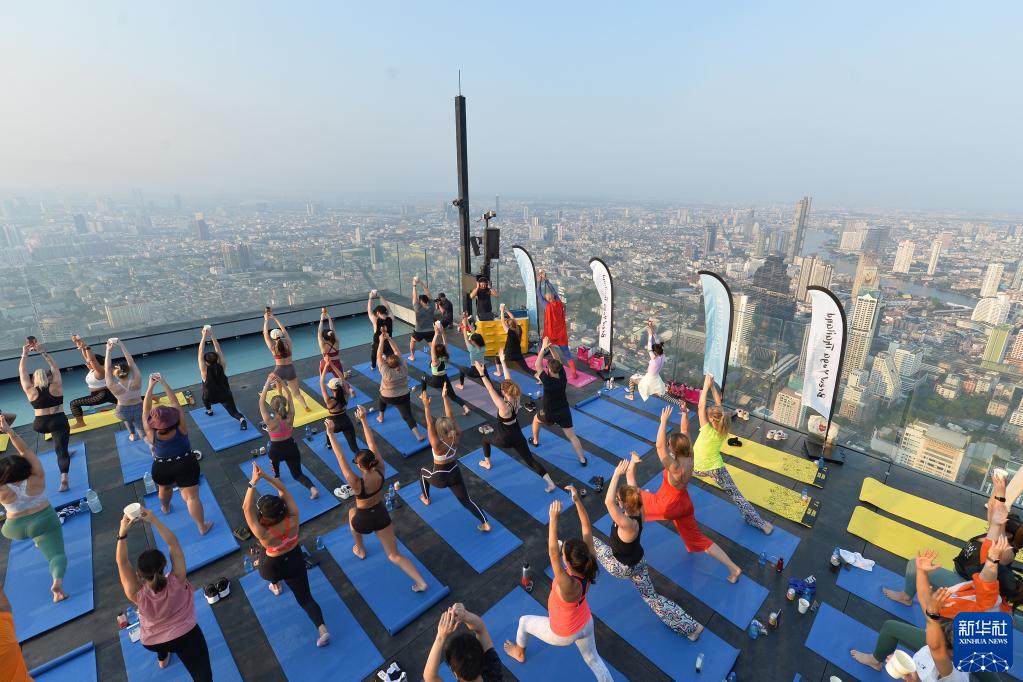 当日,数十名瑜伽爱好者在曼谷王权云顶大厦顶层观景平台体验高空瑜伽。