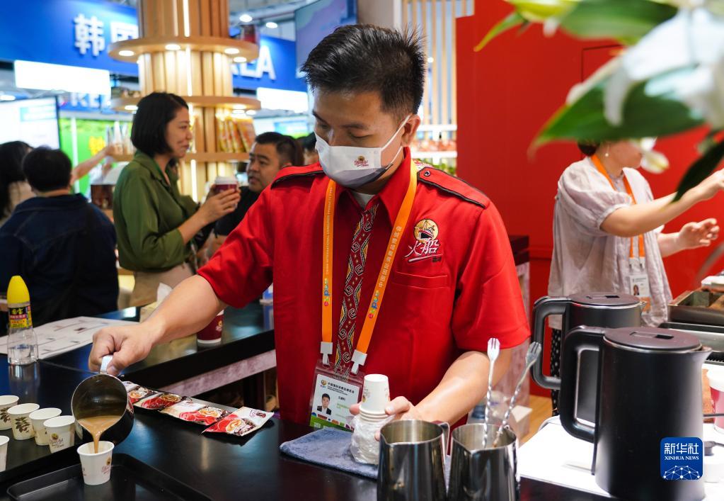 4月12日,工作人员在为参观者冲泡一款产自印尼的咖啡。