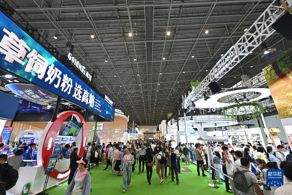 这是消博会上新西兰两大奶粉品牌高培(左)和荷仕兰的展台(4月12日摄)。