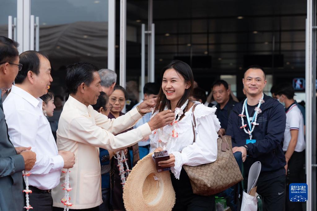 4月13日,在中老铁路老挝磨丁站,老挝官员和工作人员欢迎乘坐D887次国际旅客列车的旅客抵达磨丁。