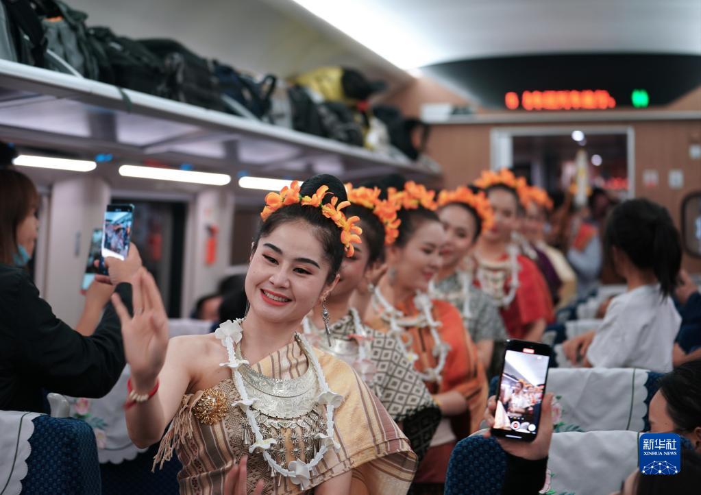 4月13日,老挝工作人员在D887次国际旅客列车上表演。
