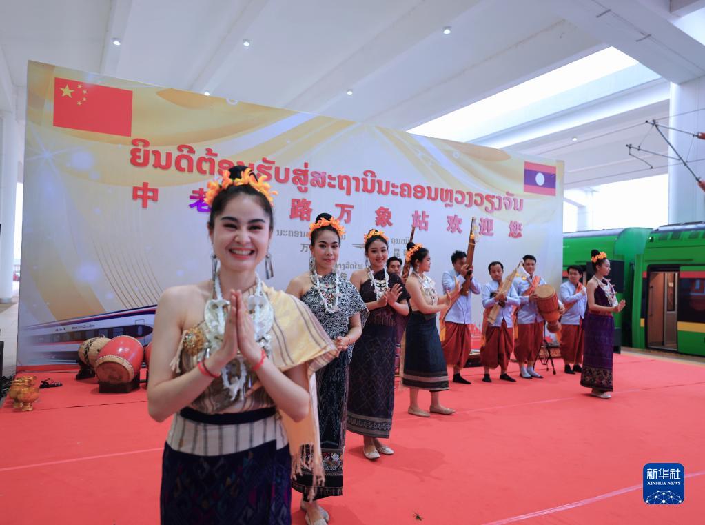 4月13日,在中老铁路老挝万象站,工作人员欢迎乘坐D887次国际旅客列车的旅客。